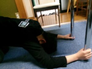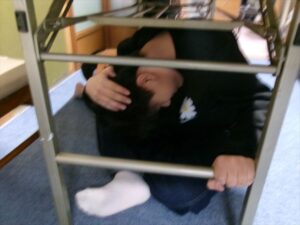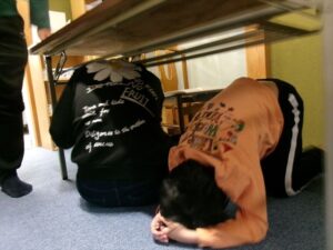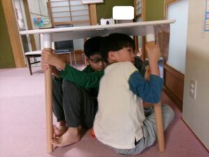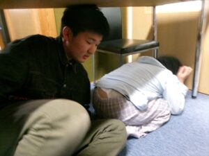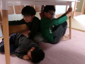 頭を守りながら、机の脚をしっかり持ち、机の下に!!