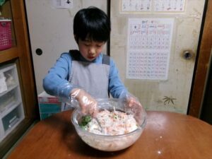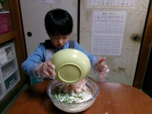 そこに、計量した材料、冷凍ネギ、塩コショウを少々振りかけて、よく混ぜていきます!