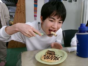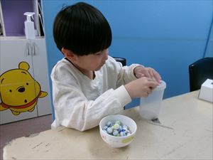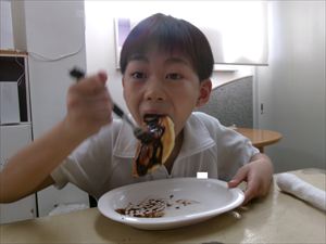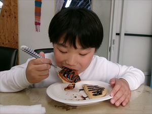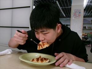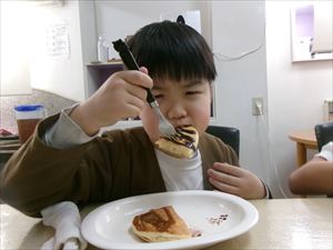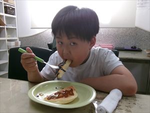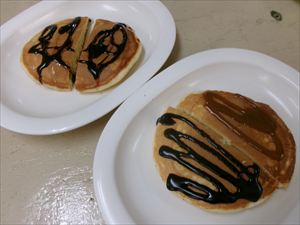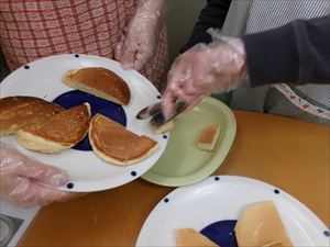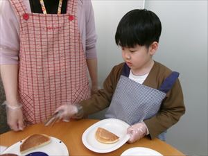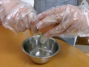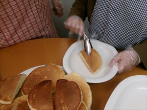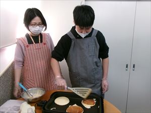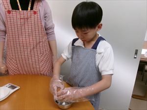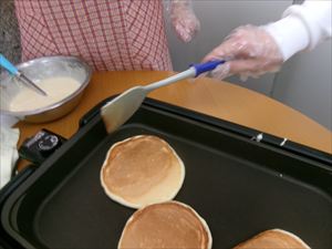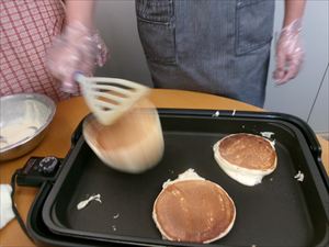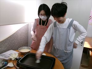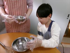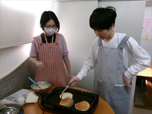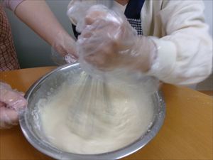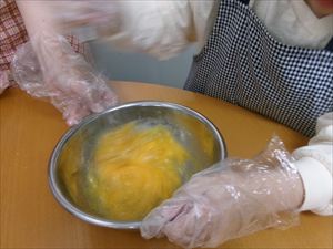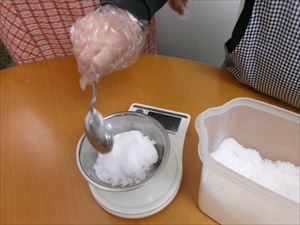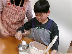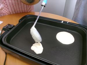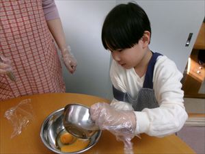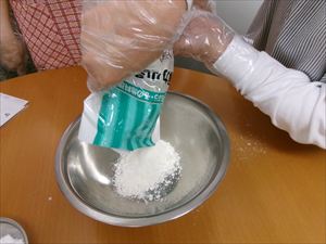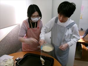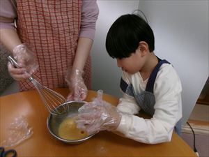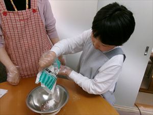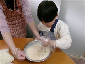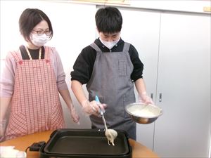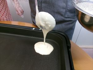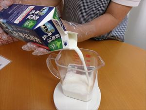 薄力粉や牛乳などの生地の材料を計量し、混ぜ合わせます。