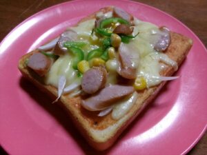 次に、食パンの上にピザソースを塗ったら、先ほど切った玉ねぎ、ピーマン、ウインナーとコーン、チーズから