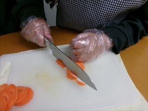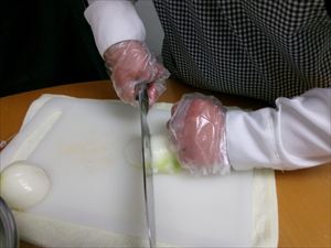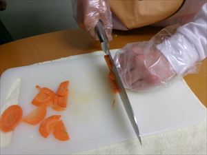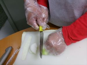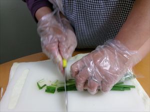たまねぎやにんじん、ニラなどの具材をカットします。